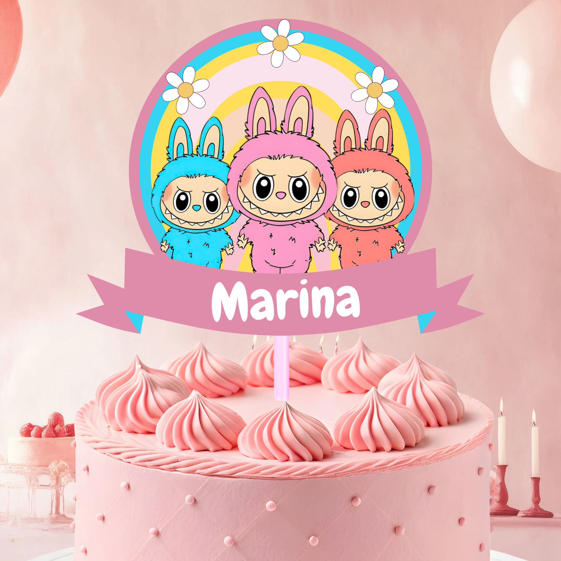 Topo de bolo Labubu super fofo e colorido, perfeito para aniversários infantis! Personalizado com o nome da criança, esse topper deixa a decoração da festa ainda mais especial. Ideal para festas temáticas, bolo decorado e mesa posta.